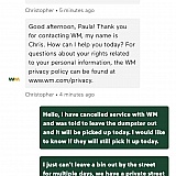 This company is horrible! Automated customer service, lazy chat service, lazy company all together. I hate waste management with a burning passion!