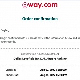 "Dear XXXX, Your booking is confirmed with us. Please review the information below and save this email for your records. Confirmation No. # OG(9 numbers), Dallas Lovefield Inn DAL Airport Parking, Check-In: Aug 02,2022 11:30 AM.