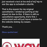 Thanks for updating our team regarding your experience, as we understand your frustration. We are sorry for any trouble regarding your experience. If you would like to speak to a member of our team please email [email protected] so we can assist. Please keep in mind, all reviews on our platform are approved by Way and pending approval from our partners as well. This has been escalated to our internal management team to investigate at this time. Please keep in mind, Way.com is an online marketplace and does not operate any of our partnered locations. We currently only serve as an online option for discounted parking and vehicle services etc. Thank you for taking the time to bring this to our attention. We will use the feedback to improve and to ensure this doesn’t happen again.