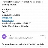 My review is for executive resolutions team Ryan. This guy has no common sense, it's like speaking to a robot. I returned a dining set from wayfair through FedEx label that he provided and apparently the package wasn't received by wayfair. When I spoke to FedEx they're giving me a different tracking number and saying it was delivered to wayfair. But Ryan doesn't want to look into this and keeps saying no money will be refunded because wayfair didn't get the item. Is this guy stupid? I can't even start a claim with fedex because I'm not the sender. So pretty much stuck here! Will never shop at wayfair again and people please refrain from buying from this website!
