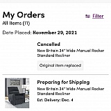 Horrible experience with Wayfair, customer service has bern unable to provide me when my order shopped and a date of arrival since it didn't get here on the date originally specified. The order is a group present to our son, the only present we have for him. I ordered the recliner on November 28,2021, now December 21 and it still hasn't arrived