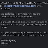 I recently ordered a sweatsuit from White Fox. Immediately after placing my order, I realized the wrong size was on the order page and I emailed the company to see if they would change the size. Not long after, I received an email stating that they could not help me due to my order already being processed and that I could submit a return. Most online companies will let you cancel or modify an order immediately after submission. I proceeded to try and return my order, and I was made aware that the company charges over $10 for a return label that is the customers responsibility to print. While I understood I would only being given store credit, a $10 fee was unnecessary. I then received an email from another store representative named Mikaela stating "it is your responsibility as the customer to read and understand all policies prior to purchase." This response was unnecessary as Mikaela could have just stated they could not help me further. To tell a customer it is their responsibility to "understand" before buying is very degrading and mean.
