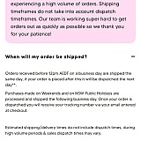 Placed an order on Nov 5. And paid express shipping. Emailed them Nov 10 to ask why it has not shipped yet. Email today, Nov 15 stating be patient with a link to their site and timeframes for order processing and shipping. Basically within 24 hrs of placing an order it will be processed and shipped (unless weekend which will then be a Monday).