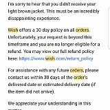 So I placed an order on Wish for a total of $57.72, a supposedly good deal for a leather jacket until I did not receive the jacket and lost my money. My son had previously ordered a jacket which took about 3 months to arrive. So, as I tracked the order (Nov 22,2020 Processing order, Nov 24,2020 Order processed in China, Nov 26,2020 Shipped in China, Dec 1,2020 Arrived at Wish facility in China), I wasn't too worried about Wish scamming me since waiting for long periods for an order to arrive seems to be part of the deal. When the jacket wasn't delivered on Dec 21,2020 as it was supposed to, I did what Wish advises – "For any inquiries regarding order statuses and issues about an item ordered, please contact us via Wish Assistant in the app or on our Website at https://www.wish.com/customer-support-center." Several times I contacted Wish through these means but all I got were automated responses. About six months later, I persisted and finally received a reply from a James saying, "I'm sorry to hear that you didn't receive your light brown jacket... Wish offers a 30-day policy on all orders. Unfortunately, your request is beyond this timeframe, and you are no longer eligible for a refund." So, I'm writing this review to warn anyone trying to buy from Wish. Simply put, "you buy at your own risk!" Wish uses a marketing gimmick to lure you in, and as they promise you the supposed incredibly low price and tell you that the catch is your willingness to wait for a while, they don't tell you that THERE IS A POSSIBILITY THAT THE ITEM YOU PAID FOR MIGHT NOT ARRIVE AND YOUR MONEY WILL NOT BE REFUNDED IF YOU DON'T REALIZE IN TIME THAT YOUR LONG WAIT FOR YOUR ITEM HAS BECOME TOO LONG. Wish is comfortable dealing with vendors that it will not hold accountable to ensure that they deliver products they have been paid for and the customer is the ultimate loser. So hopefully, you will not be drawn to the seemingly low prices that Wish offers, it is not worth it.