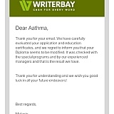 I need to talk about WriterBay cause it was important to get the word out before people tend to waste their precious time on this website. To introduce myself, I am a final year law student at a premium law school in India. I applied for the registration process at Writer Bay and the Support team rejected my application. I appealed saying they should reconsider my application. But Melanie and her managers thought I "modified" my "diploma". I was honestly surprised at the sheer ignorance on their behalf. First of all, I get a Bachelor of Science, LLB from my 5 year integrated course. Secondly without zero proof and sheer stupidity, Melanie thought it was okay to blurt out that I forged my Mark sheet.