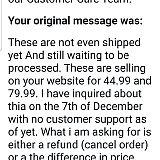 Ordered on the 3rd of December so I would receive things in time for Christmas. After a week still said they were processing. When I tried to get a refund WITHIN the 14 day period on their website said they couldn't and would only give me a refund on one item only because they had sold out. After numerous messages finally said it would be shipped within the next few days. Finally on the 22nd of December the 2 items were shipped. Finally received them on the 10th of January. I contacted fair trade whim said They are a UK run company therefore they can't assist- do not order from. When asked to write a review said I would ensure everyone knew they were a scam site. Did receive an email to write feedback. It was not positive and their website has a slavery policy at the bottom. BIG RED FLAG.