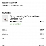 I ordered a personalized mug on 12/2/20 which was to be a birthday gift on 12/16/20. When I ordered, estimated delivery was 12/10. Here we are on 12/17/20 and it hasn't even shipped yet. The first time I contacted customer service, they said it would be delivered between 12/11-12/14. Then I get a message today saying production is delayed and it takes 10-12 days from ordering to be shipped. Well 10-12 days from 12/2 has already passed and the mug isn't even done yet. If you want to take chances ordering from here, go for it but don't expect to receive your item by their posted delivery date. Very disappointed and the only reason they got 2 stars is their customer service responds pretty timely.