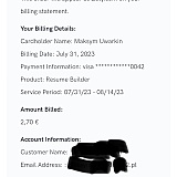 I was billed a total of $213.30 for 9 months after my $2.70 for a 14-day trial period expired without realizing it. Zety did not notify me or send me any e-receipts for each time they billed, nor did they notify me that the service had automatically renewed. I discovered this by checking my card activity on the bank application and discovering unusual charges that spanned from 25/03/2023 to 4/11/2023. So, on November 4,2023, I wrote to customer support requesting a full refund for each month they had billed me and asked them to remove my billing information from their website because there was no activity on my account. It is impossible to remove your current billing information once you have submitted it on the website unless you add a new card for them to scam you. In addition, I contacted Zety via Facebook Messenger, and the social media team advised me to write an email to their customer service or submit a form on Zety and expect a response within 48 hours. Nobody has contacted me or responded to my email as of today. I have to call my bank to disable my card and issue me a new one. I believed I was the only one who had a terrible experience that couldn't be resolved. But I notice a lot of people on here are having the same issues. The customer care representative who responds to each review here merely defends themselves and does not actually solve anything. So, don't use Zety. Do not enter your credit card information on their website.