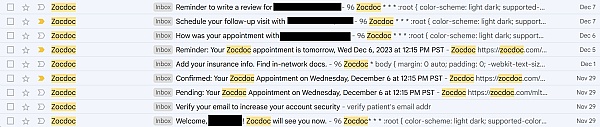 I signed up for one appointment via Zocdoc. That seems to have been enough to trigger NINE SEPARATE EMAILS (1. Welcome to Zocdoc, 2. Confirm your email, 3. Pending appt, 4. Confirmed appt, 5. Add your insurance [though I did that when I signed up for the appt], 6. Appt reminder, 7. Rate your visit, 8. Schedule your follow-up, and 9. Another rate your visit), as well as THREE TEXTS (1. Appt reminder, 2. Appt details, 3. Rate your visit).